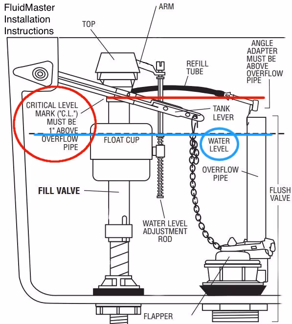 The most common direct cross-connection to a health hazard in the home is an improperly set up toilet. Ensure all toilet fill valves are air-gapped to prevent backsiphonage of tank water, chemicals, and bacteria into the household plumbing system. Ensure the Critical Level mark is 1" above the top of the overflow pipe and the refill tube discharge is above the overflow pipe.